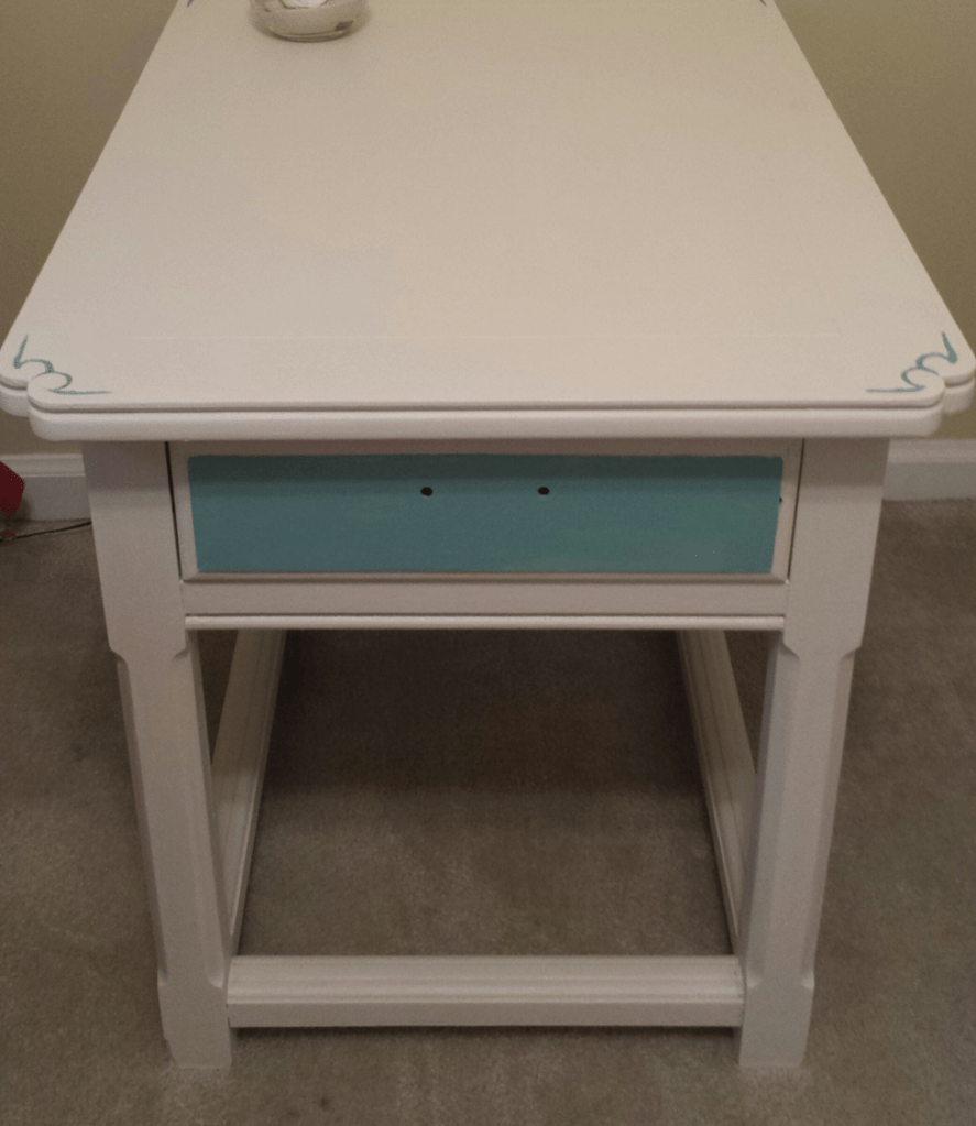 With a steady hand, I coated the nightstand in the butter white color, ensuring even coverage. The transformation had begun. For the carvings, I opted for a small, regular paintbrush, meticulously hand-painting each detail with the chosen turquoise shade. The result was nothing short of splendid.